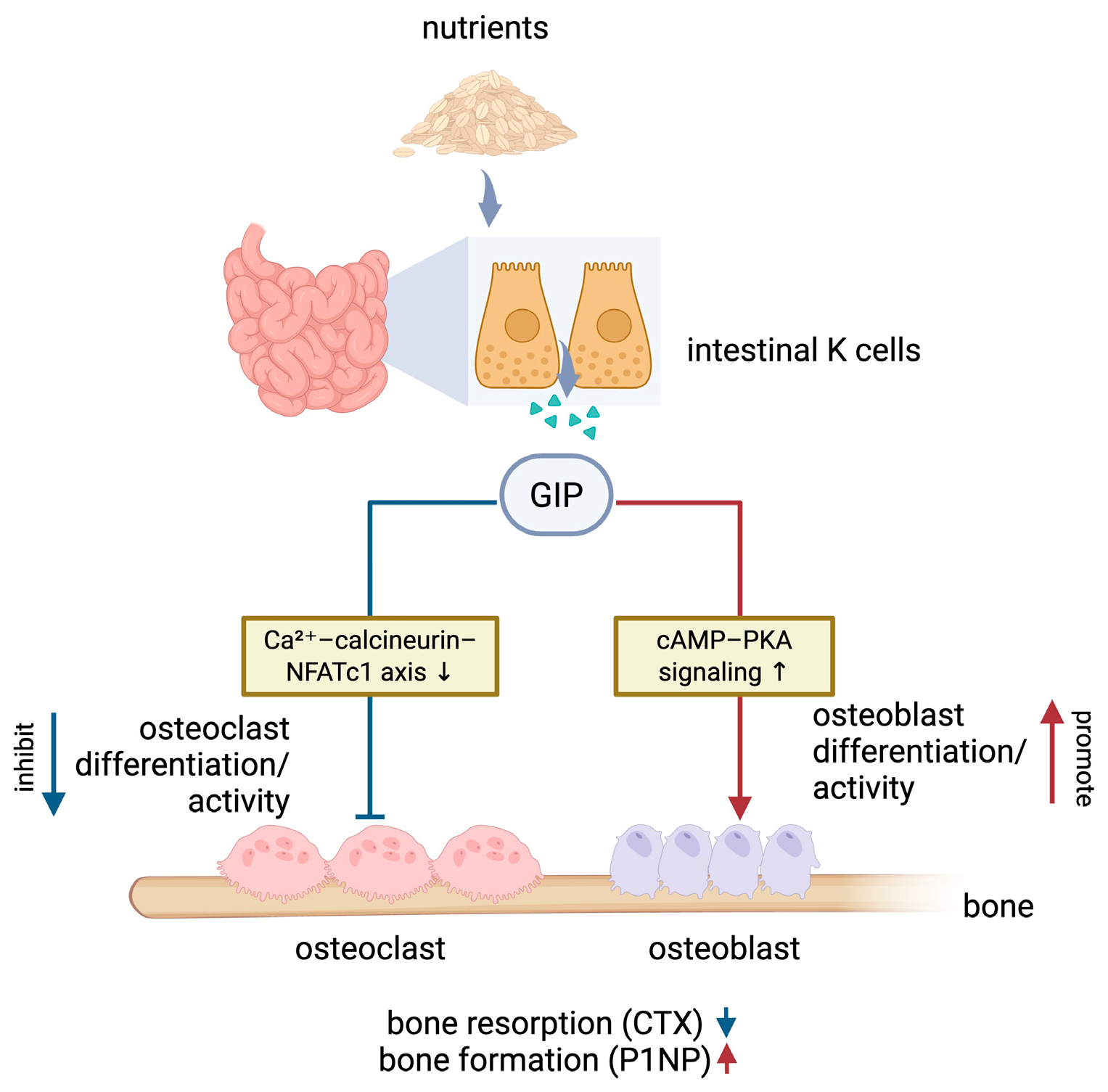 | Health | Postprandial bone resorption ↓ Maintaining skeletal homeostasis | Bone resorption ↓; formation ± ↑ Cortical bone properties ↑ |