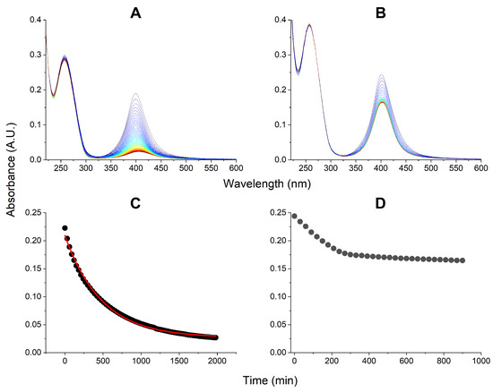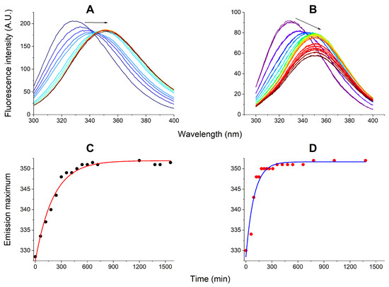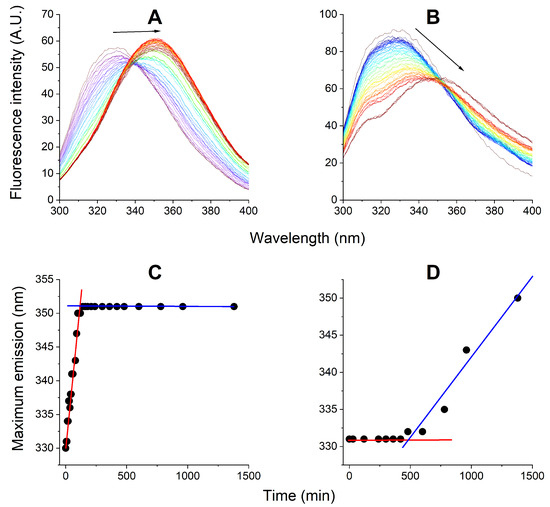 The interactions of AgNPs with EMAP II, tRNA, and their complex were investigated for 1 M EMAP II dissolved in the optimized buffer described above and 1 M tRNA, where appropriate. Some protein stability experiments were performed in the presence of 50 M TCEP, taking into account its detrimental effect on AgNPs. The fluorescence and UV-Vis experiments were performed in parallel with the same samples. Figure 1 presents the effect of incubation with 165 pM AgNPs on the EMAP II stability, monitored using the fluorescence of its Trp residues. The redshift of fluorescence emission indicated the increased exposure of Trp indole rings to solution [40]. Therefore, the presence of AgNPs caused the protein denaturation. In the presence of TCEP (Figure 1A) the spectral changes exhibited an isosbestic point, along the shift of emission maximum from 330 to 352 nm, while the emission intensity only slightly decreased. Hence, in this case the EMAP II the unfolding occurred between two defined conformations, the folded (native) and partially unfolded ones. In the absence of TCEP (Figure 1B), the second phase of EMAP II denaturation was observed. It was characterized by the significant decrease of fluorescence intensity, but the emission maximum remained at 352 nm. Therefore, the fluorescence emission maximum plotted against time of incubation could be used to track the first denaturation phase specifically. These plots are presented in Figure 1C,D for the reactions with and without TCEP, along with 1st order kinetic fits, which yielded values of 143 ± 10 and 65 ± 9 min, respectively.