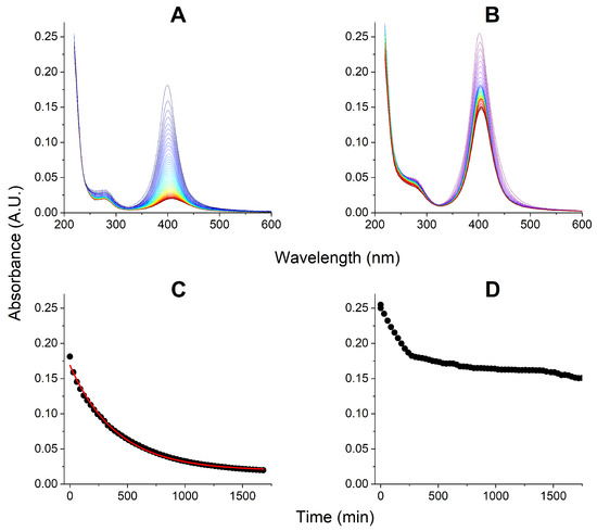 The kinetics of decay of 165 pM AgNPs in the presence of 1 M EMAP II in 20 mM Tris, 0.2 mM MgCl2, 5 M ATP, pH 8.0, and the presence (A) or absence (B) of 50 M TCEP. The kinetic plots at 399 nm for these reactions are presented in panels (C) and (D), respectively. The 1st order kinetic fit in panel (C) is provided as red line.