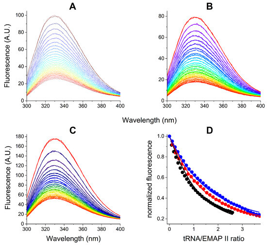 Fluorescence titrations of EMAP II at concentrations of 5 M (A), 3.5 M (B) and 2.5 M (C) with tRNA in the presence of 20 mM Tris/HCl, 0.2 mM MgCl2, 5 M ATP, and 50 M TCEP, pH 8. The spectra were recorded in triplicate in 5 min intervals for the starting sample and after each tRNA addition. No kinetic phenomena were observed. The affinity constant was calculated by the global fit of the binding isotherm to all three experiments (D). Black, red, and blue symbols correspond to normalized fluorescence at 330 nm of 5 M, 3.5 M and 2.5 M EMAP II, respectively.
