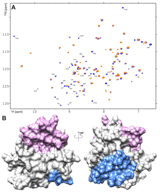 (A) The 1H-15N HSQC spectrum of EMAP II recorded in the presence of AgNPs, and a small amount of paramagnetic species, CrAcAc. The blue and yellow-coded signals mark the spectra recorded in the absence and presence of the paramagnetic relaxation agent. (B) Two regions on EMAP II surface which are, more probably, interacted with AgNPs as follows from paramagnetic NMR data.