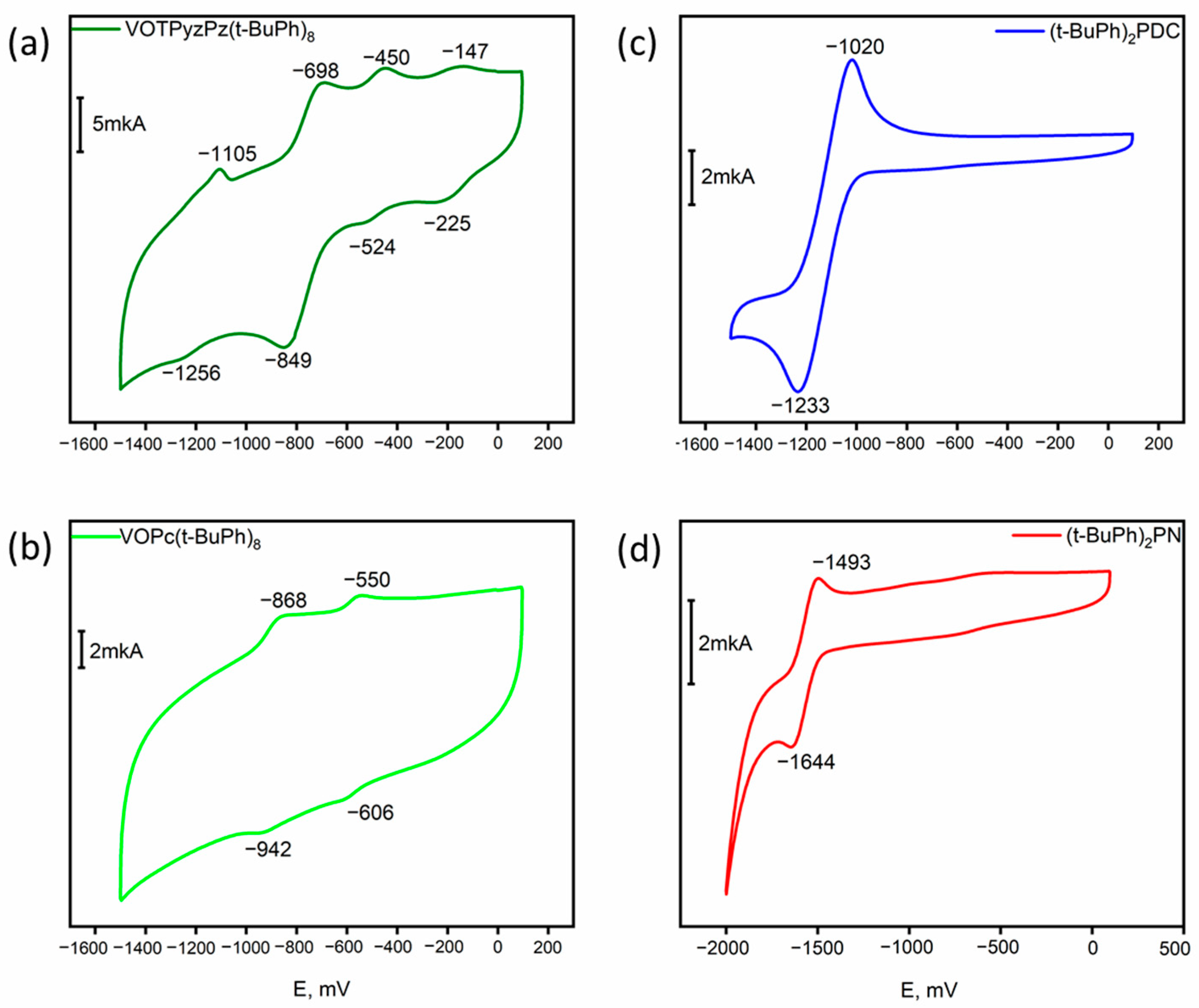 - Finogenov, D.N.; Faraonov, M.A.; Kopylova, A.S.; Ivanov, T.E.; Romanenko, N.R.; Yakushev, I.A.; Konarev, D.V.; Stuzhin, P.A. Perchlorinated vanadyl tetrapyrazinoporphyrazine: Spectral, redox and magnetic properties. New J. Chem. 2024, 48, 10067–10073. [Google Scholar] [CrossRef]