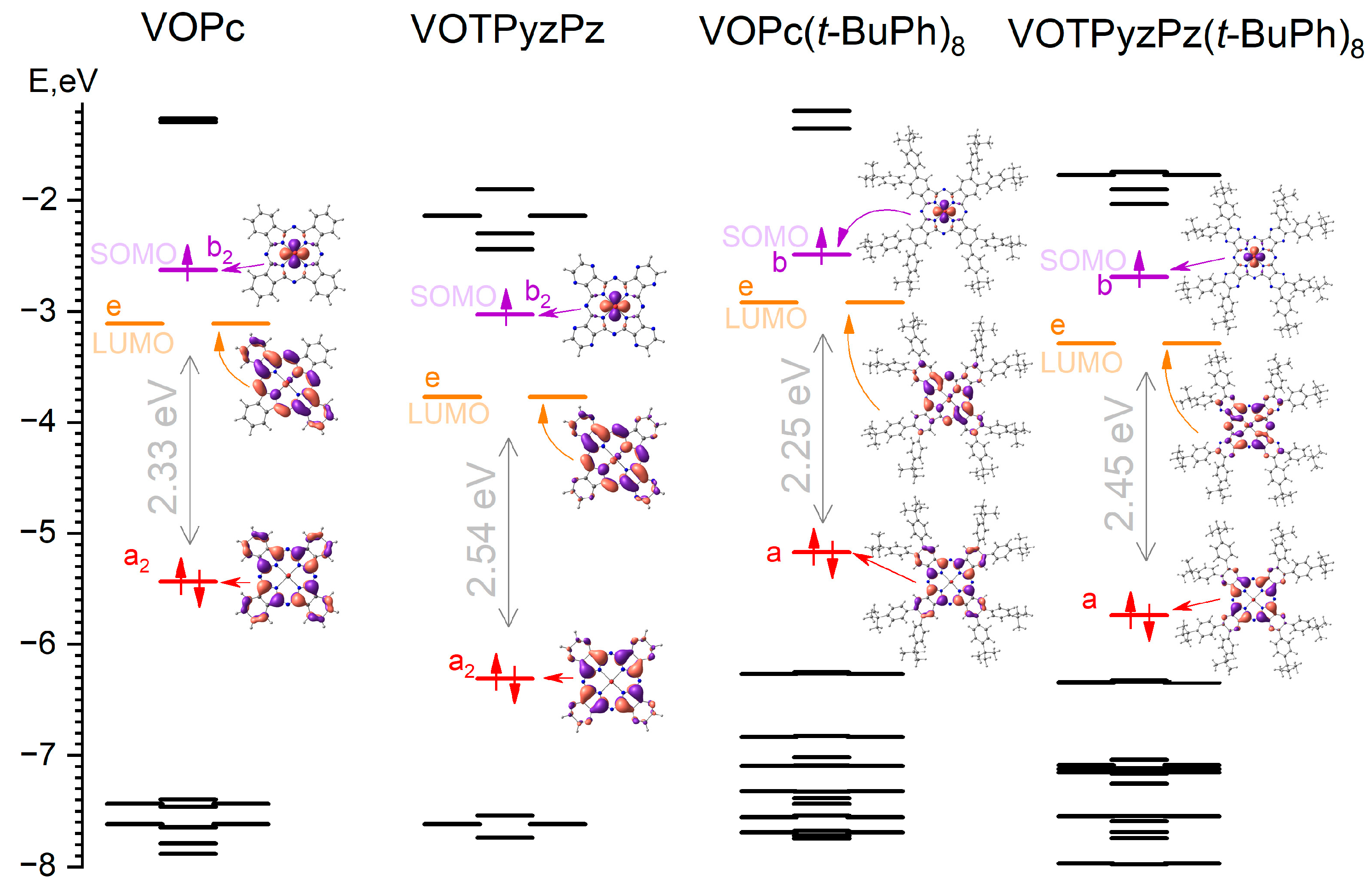 | VOPc(t-BuPh)8 | −3.49 | −2.92 | 1.66 | 2.25 | −5.15 | −5.17 |