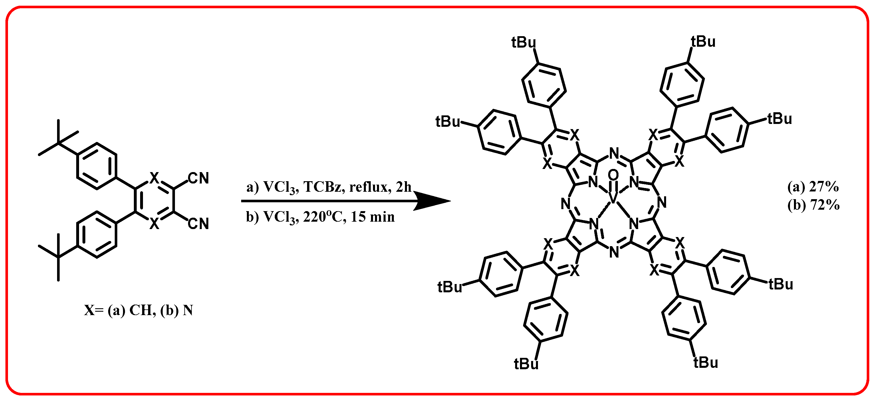 - Freyer, W. Okta-(4-tert-butylphenyl)-tetrapyrazinoporphyrazin und davon abgeleitete Metallkomplexe. J. Prakt. Chem. 1994, 336, 690–692. [Google Scholar] [CrossRef]