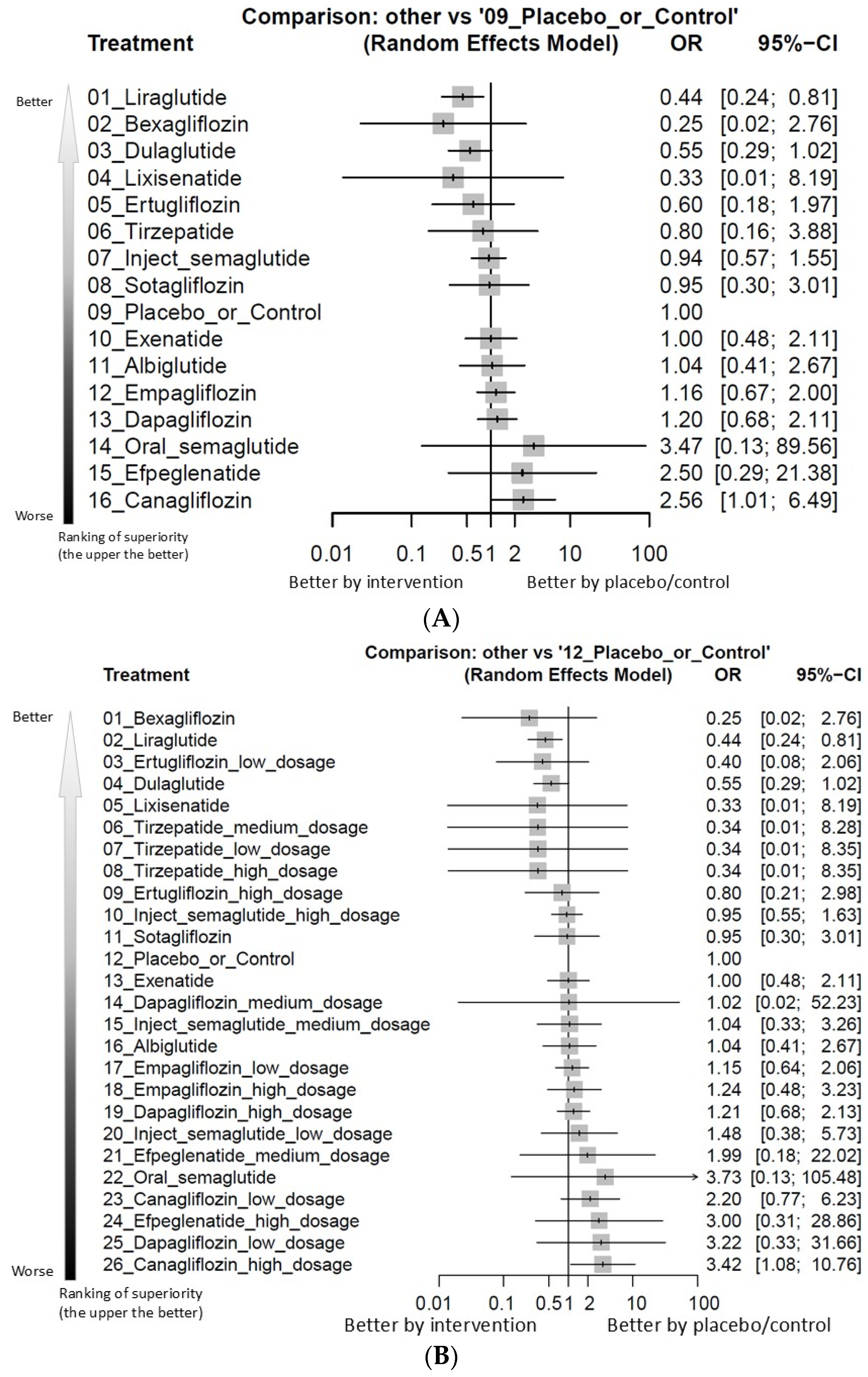 | 0.17 [0.01; 2.65] | 0.30 [0.07; 1.30] | 0.27 [0.03; 2.25] | 0.37 [0.08; 1.63] | 0.22 [0.01; 7.24] | 0.23 [0.01; 7.32] | 0.23 [0.01; 7.39] | 0.23 [0.01; 7.39] | 0.54 [0.08; 3.55] | 0.64 [0.15; 2.70] | 0.64 [0.11; 3.78] | 0.67 [0.17; 2.60] | 0.68 [0.14; 3.15] | 0.69 [0.01; 44.05] | 0.70 [0.19; 2.65] | 0.70 [0.14; 3.64] | 0.77 [0.18; 3.37] | 0.84 [0.16; 4.37] | 0.81 [0.19; 3.51] | Inject_ semaglutide_ low_dosage | ||||||