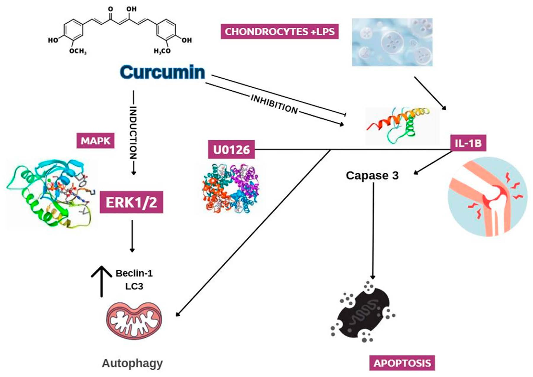 Several recent studies have explored the therapeutic effects of curcumin in OA models, highlighting its multi-targeted role in modulating key cellular pathways. Curcumin was reported to promote autophagy, suppress apoptosis, and preserve mitochondrial function in chondrocytes exposed to pro-inflammatory stimuli such as IL-1β and LPS [