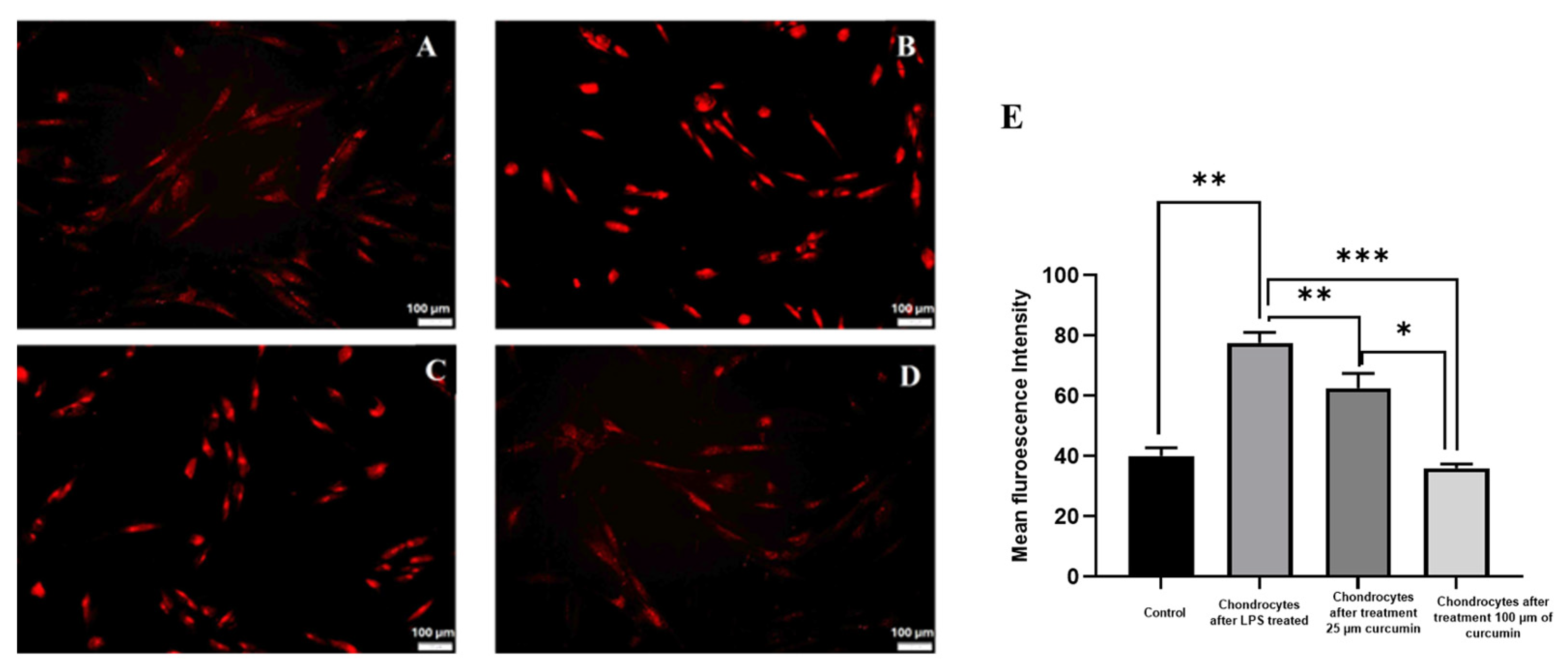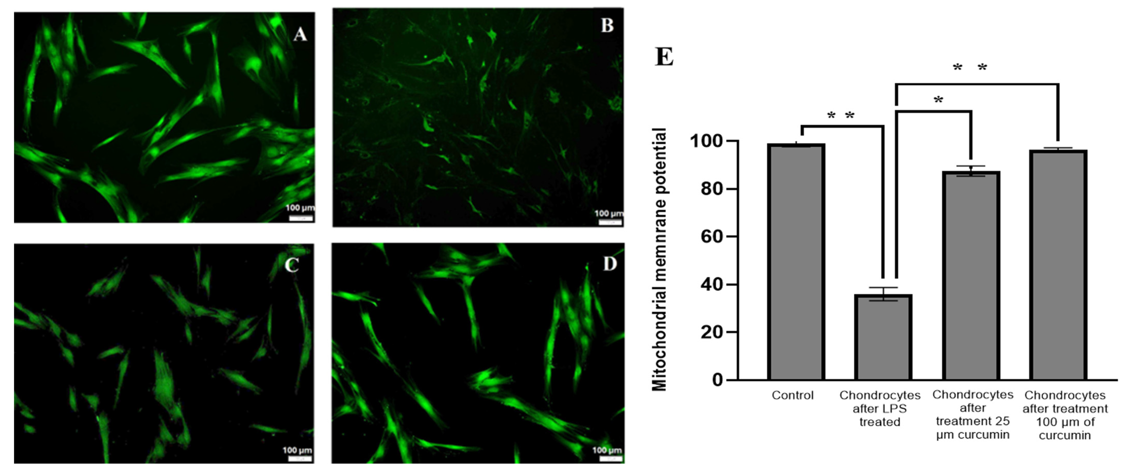 Therefore, the present study aimed to evaluate the alterations in mitochondrial membrane potential in LPS-induced osteoarthritic chondrocytes and to investigate the potential protective role of curcumin, a naturally derived polyphenol with known anti-inflammatory and antioxidant properties, in restoring mitochondrial function [