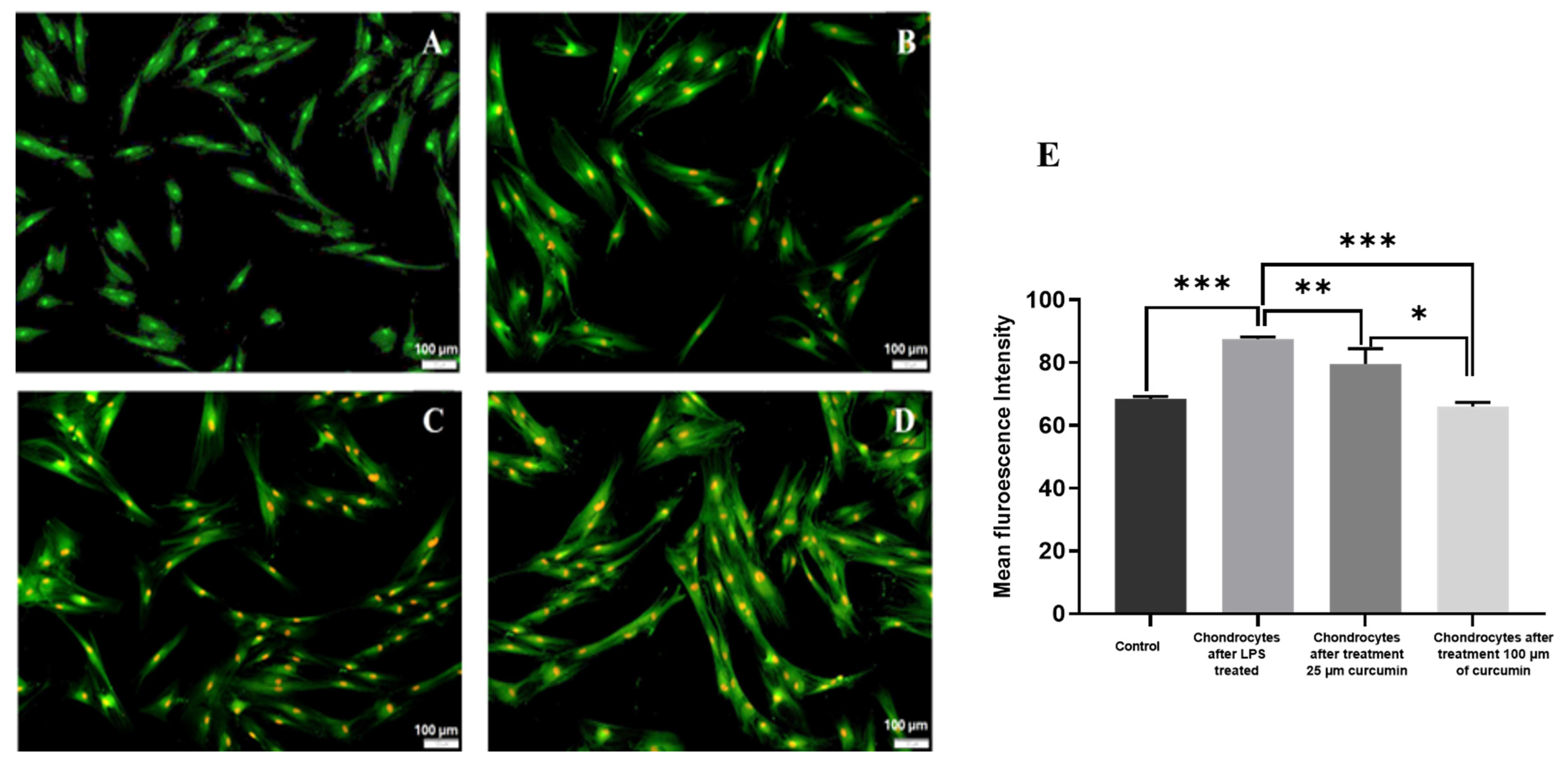 In this staining, differentiated chondrocytes derived from BMSCs were seeded into 24-well plates and exposed to 10 µg/mL of LPS to induce an inflammatory state resembling osteoarthritic conditions. To investigate the potential cytoprotective role of curcumin, the LPS-stimulated chondrocytes were treated with 100 µM Curcumin for 24 h [