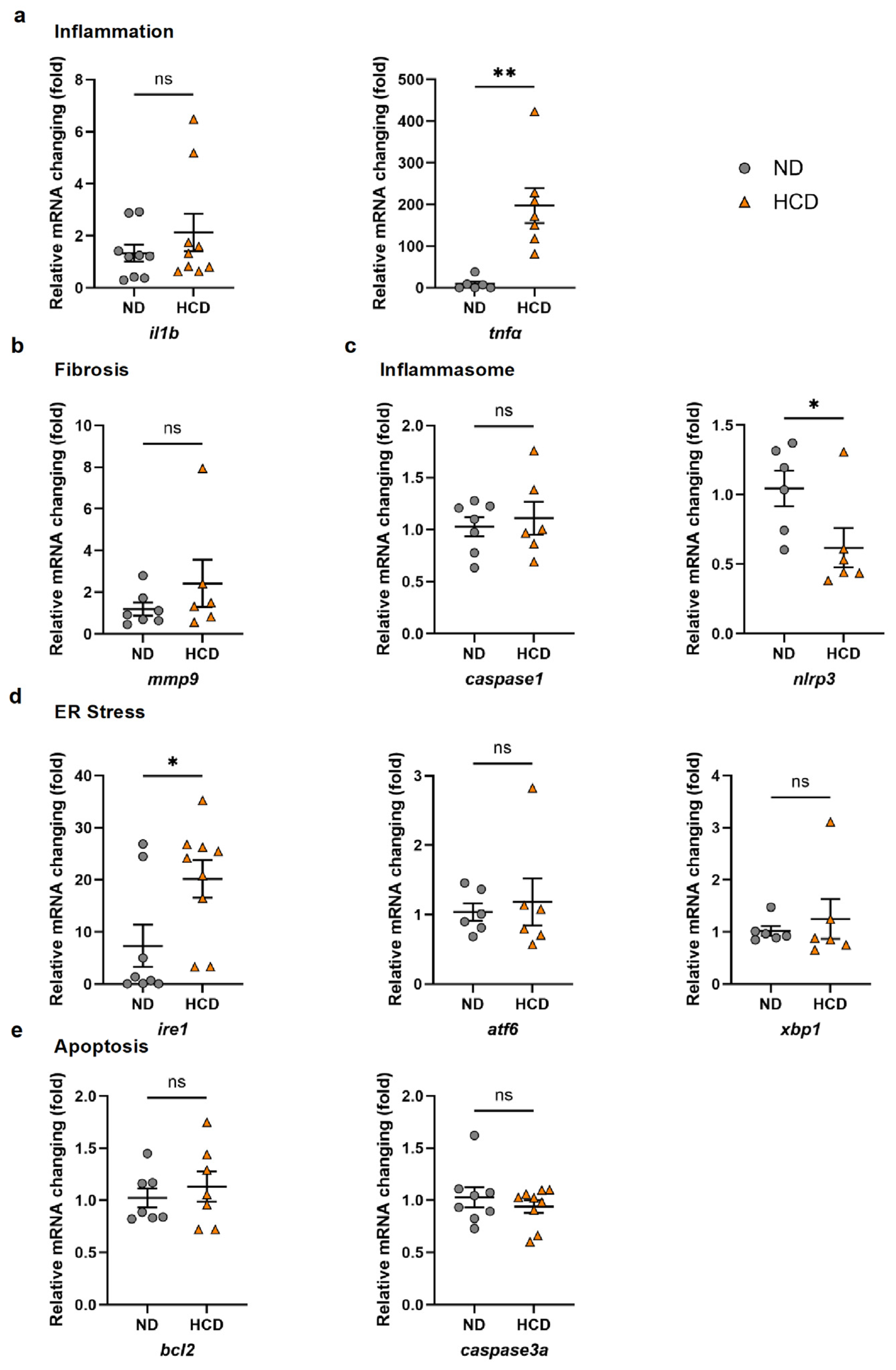 2.2. HCD Induces Inflammatory, Inflammasome-Related, and ER-Stress Gene Expression in the Zebrafish Liver