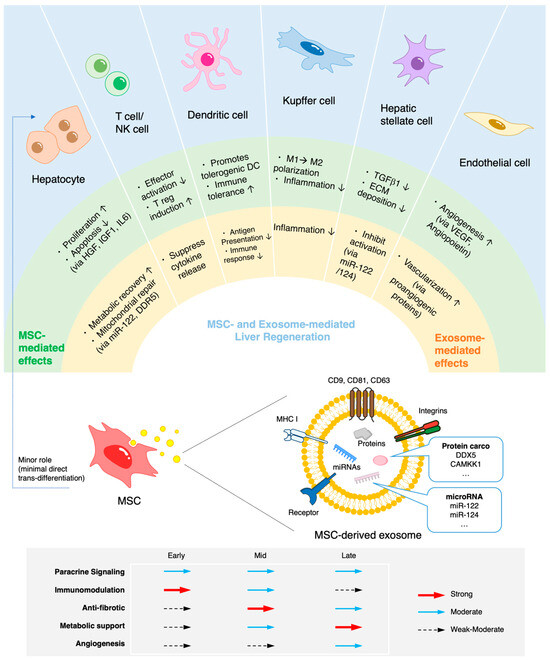 In light of these limitations, regenerative therapies that modulate the hepatic microenvironment have emerged as a promising strategy to restore functional interactions among hepatocytes, nonparenchymal cells, and the extracellular matrix (ECM), while improving metabolic and inflammatory balance [7]. Among the various regenerative strategies under investigation, mesenchymal stromal/stem cells (MSCs) and MSC-derived exosomes have attracted attention because they offer diverse regeneration-promoting mechanisms [7].