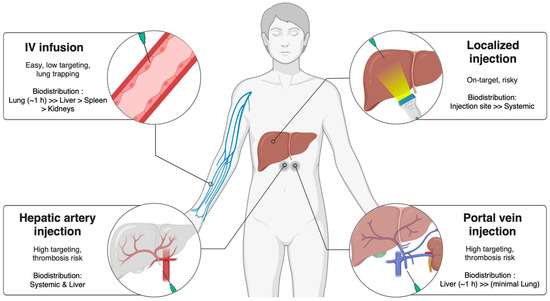 The administration route significantly influences biodistribution, therapeutic efficacy, and procedural risk, especially in therapies involving MSCs and EVs [85,86,87,88]. Common delivery methods include peripheral intravenous (IV) infusion, portal vein or hepatic artery injection, and localized intrahepatic delivery.