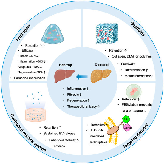 Controlled-release systems, including nanoparticles, liposomes, and hydrogel composites, enable sustained EV release, improving stability and extending the therapeutic window [111,134,135,136]. This approach reduces dosing frequency and enhances patient compliance, which is particularly important in chronic liver diseases requiring repeated administration [137,138]. Targeted delivery is further optimized by modifying the surface of carriers with ligands recognizing liver-specific receptors, such as asialoglycoprotein receptor, thereby enhancing on-target efficacy and minimizing off-target effects [139,140,141,142]. For instance, galactose or N-acetylgalactosamine residues displayed on modified MSC-EVs can specifically bind asialoglycoprotein receptor on hepatocytes, promoting receptor-mediated endocytosis and efficient intracellular uptake [142]. Strategies such as PEGylation of MSCs have also been shown to reduce nonspecific adhesion in the lung, facilitating delivery to target sites [141]. Figure 3 summarizes biomaterial-assisted strategies for enhancing MSC and EV therapy in liver disease.