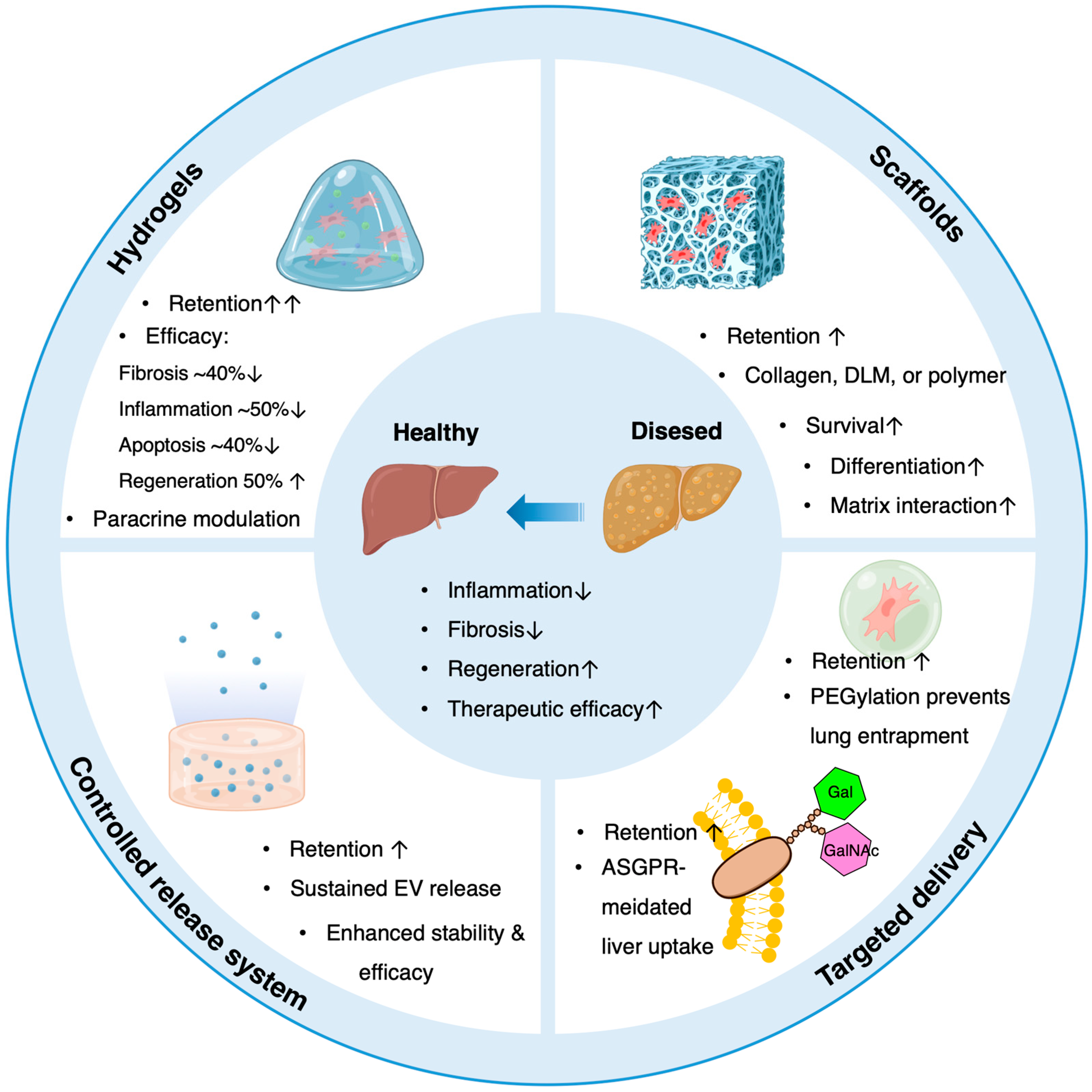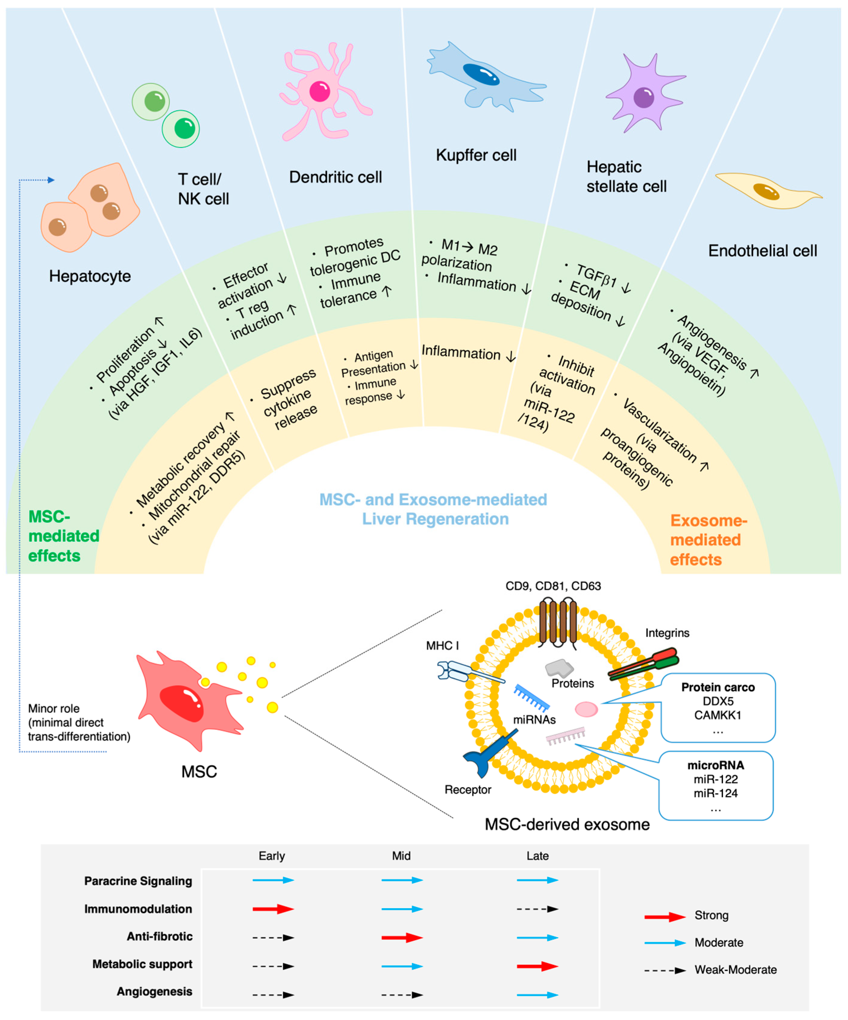 | Paracrine/Trophic | HGF, VEGF, IGF-1, IL-6 | Promote hepatocyte proliferation, inhibit apoptosis, enhance tissue perfusion | [56,57,58] |