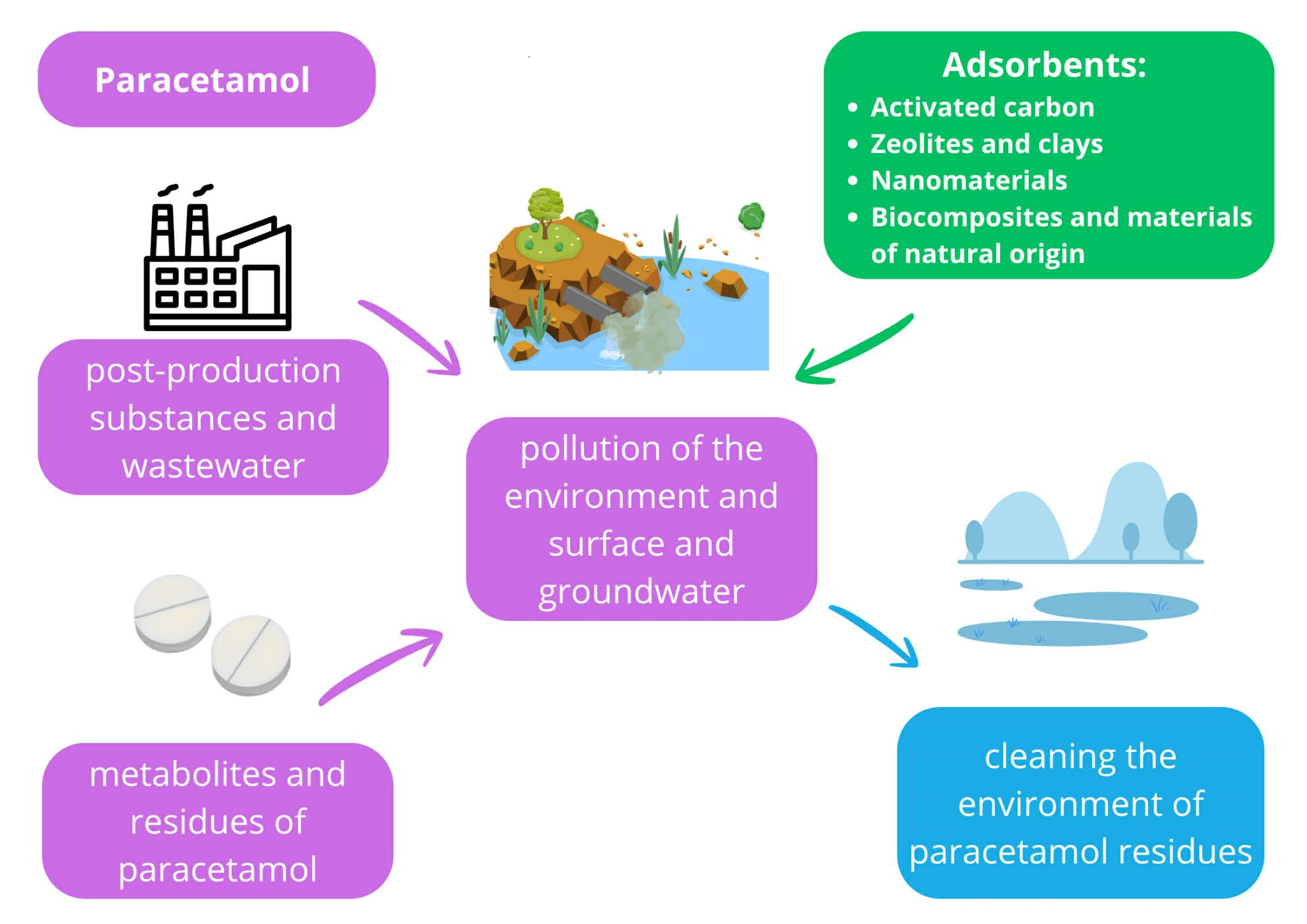 The functioning of adsorbent materials in the process of adsorption is characterized by adhesion of a liquid to the surface of the sorbent, resulting in the formation of a thin film. Adsorbent sorbents attract the liquid to their surface due to forces of molecular attraction. Multiple materials are used to adsorb paracetamol from the environment.