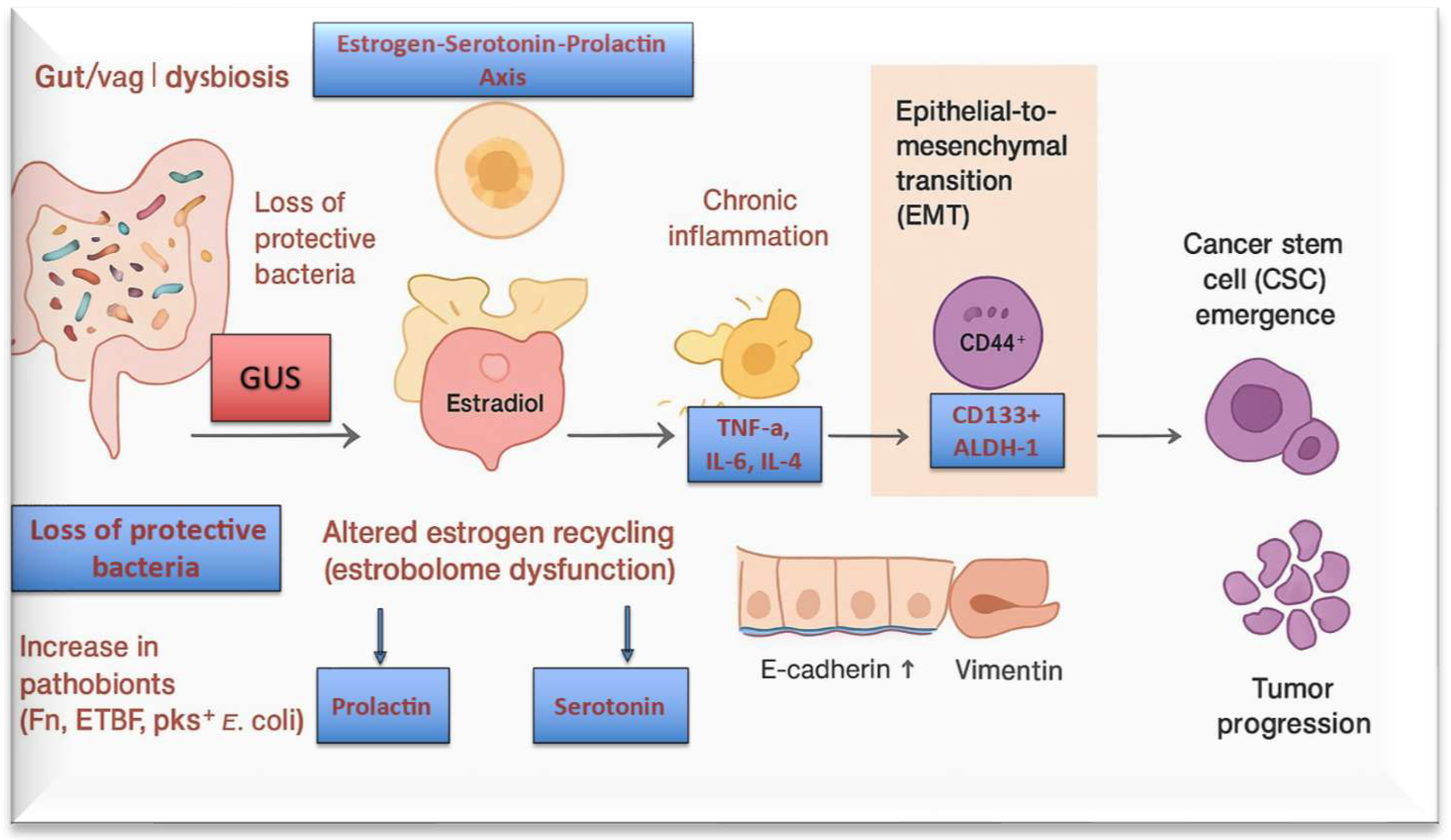 | Lactate–GUS axis | Lactate-driven acidification increases macrophage GUS activity | Reactivation of estrogen metabolites and toxins → stem-cell destabilization |
