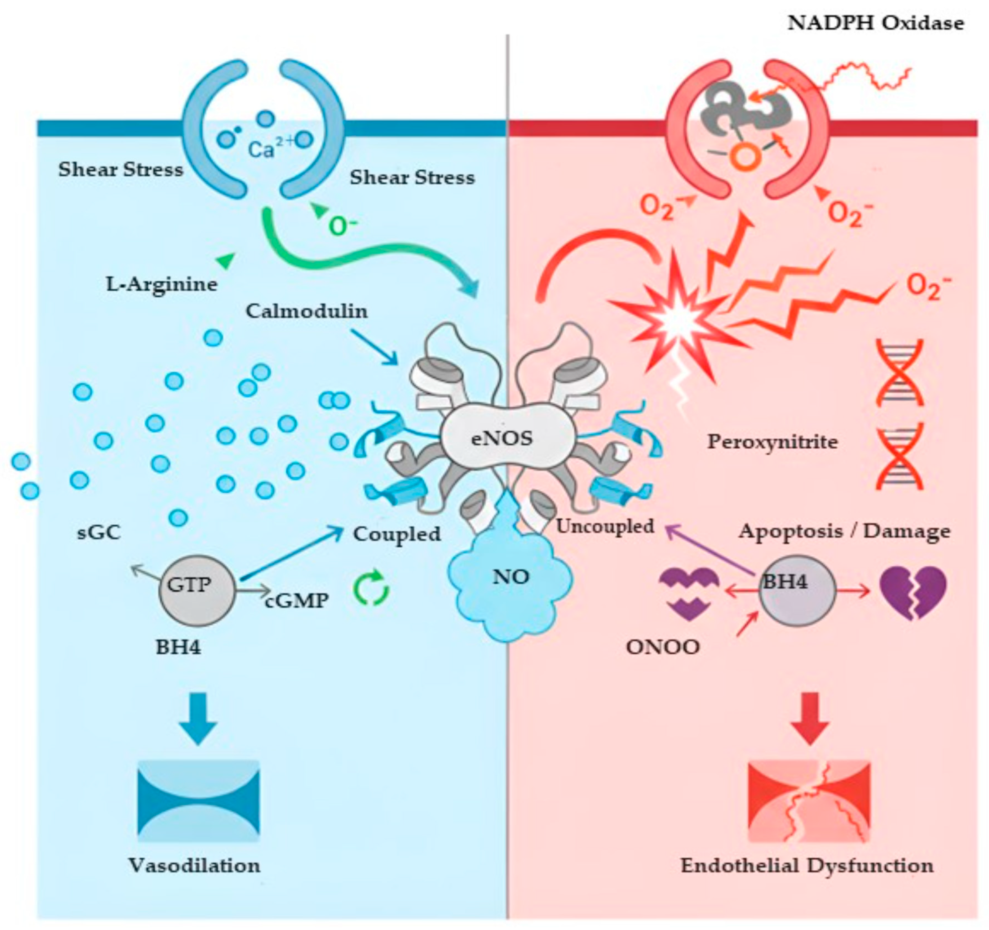 - Janaszak-Jasiecka, A.; Płoska, A.; Wierońska, J.M.; Dobrucki, L.W.; Kalinowski, L. Endothelial dysfunction due to eNOS uncoupling: Molecular mechanisms as potential therapeutic targets. Cell Mol. Biol. Lett. 2023, 28, 21. [Google Scholar] [PubMed]