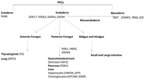 Schematic representation of directed differentiation of induced pluripotent stem cells (iPSCs) into derivatives of the three germ layers and their subsequent tissue specification. Marker genes specific to cell or tissue types are indicated in parentheses and grouped by their germ layer origin.