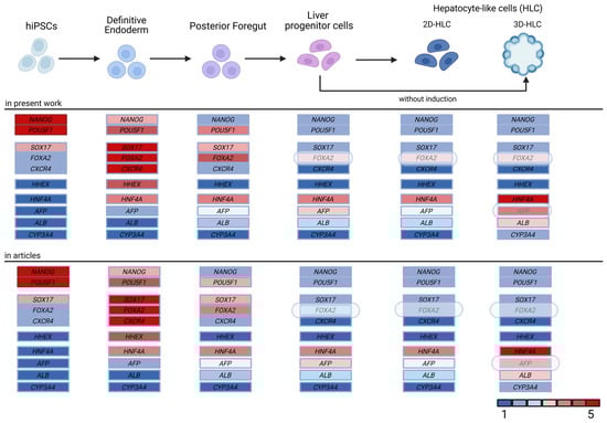 Schematic of the iPSC-to-hepatocyte differentiation protocol and a comparative analysis of key gene expression profiles between our data and published data from other research groups. Differentially expressed genes are highlighted. The color scale indicates relative expression levels, normalized from low (1) to high (5).