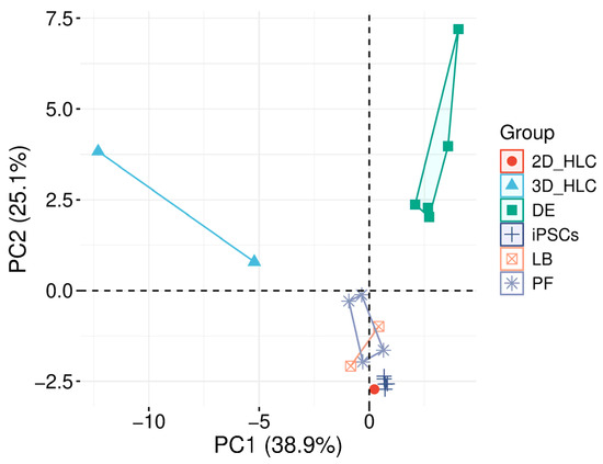 Principal component analysis (PCA) of transcriptomic profiles during iPSCs differentiation into HLCs. The plot demonstrates distinct clustering of the six experimental groups along the first two principal components, which collectively explain 64% of the total transcriptional variance (PC1: 38.9%, PC2: 25.1%). Three-dimensional hepatocyte-like cells (HLCs) and definitive endoderm (DE) clusters show clear separation along PC2, with 3D HLCs being the most distant group, indicating a profound effect of 3D culture on gene expression patterns. iPSCs, posterior foregut (PF), hepatoblast (LB), and 2D HLCs form an overlapping cluster, while DE maintains an intermediate position between early and late differentiation stages.