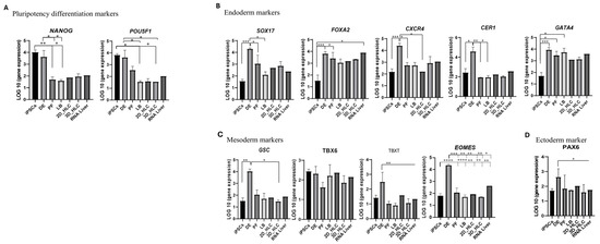 At the iPSC stage, high expression of the pluripotency markers (POU5F1, NANOG) confirmed population purity (Figure 4A). As differentiation progressed into definitive endoderm (DE), the expression of these markers declined. This downregulation became statistically significant (p < 0.05) at all subsequent stages (PF, LB, 2D-HLC, 3D-HLC), confirming the loss of pluripotency (Figure 4A and Figure 6A).