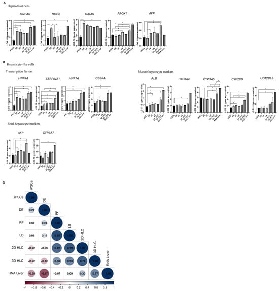 Expression dynamics of lineage-specific markers during iPSCs differentiation into HLCs. Gene expression dynamics of (A) hepatoblast markers and (B) mature hepatocyte markers during the directed differentiation of iPSCs into hepatocyte-like cells (HLCs). Significance levels: p < 0.05 (*), p < 0.005 (**), p < 0.0005 (***). (C) Stage-to-stage correlation analysis, with color scale representing Spearman’s coefficients (red: −1, strong negative correlation; blue: +1, strong positive correlation). Abbreviations: iPSCs—induced pluripotent stem cells; DE—definitive endoderm; PF—posterior foregut; LB—liver buds/hepatoblasts; HLC—hepatocyte-like cells; RNA Liver—human liver total RNA.