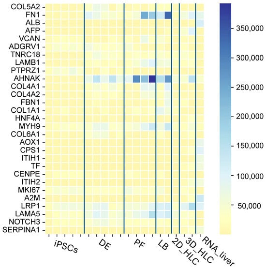 Transcriptomic profiling identified dominant molecular programs during iPSCs differentiation into 2D and 3D hepatocyte-like cells (HLCs), characterized by upregulated expression of genes related to extracellular matrix organization (e.g., COL1A1, COL1A2, COL4A1, COL4A2, COL5A1, COL6A1, FN1, LAMA5, VCAN, FBN), molecular regulators of cytoskeleton dynamics (e.g., FLNA, MYH9, TPM1, AHNAK), and intercellular signaling (e.g., PTPRZ1, NOTCH3, LRP1). This expression signature—particularly the enrichment of proliferation markers (MKI67, CENPF)—reflects an active tissue remodeling state consistent with differentiation process.