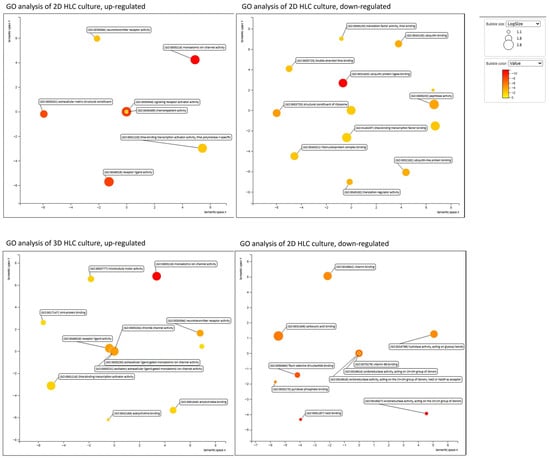 Differential expression analysis was performed using DESeq2 by comparing both 2D HLCs and 3D HLCs to human liver RNA. To reveal functional patterns among the identified differentially expressed genes (DEGs), we conducted Gene Ontology (GO) enrichment analysis focusing on the “Molecular Function” category. The results were visualized using SRplot, a freely accessible web server, and REVIGO, which implements a clustering algorithm to reduce semantic redundancy based on similarity measures [6]. The analysis was performed separately for up- and downregulated genes in both comparison groups (2D HLCs vs. human liver RNA and 3D HLCs vs. human liver RNA) (Figure 9).