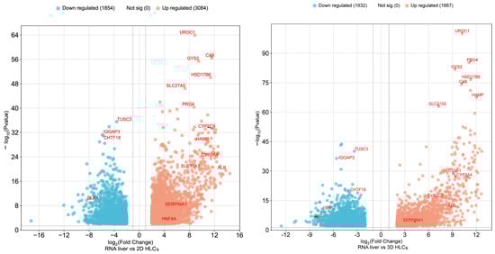 Volcano plot analysis was used to visualize differential gene expression in hepatocyte-like cells. The plot displays transcriptomic comparisons of 2D HLCs versus human liver RNA and 3D HLCs versus human liver RNA. Two-dimensional HLCs show an explicit deficiency in key hepatocyte functions, with significant downregulation of genes encoding urea cycle enzymes (UROC1), glycogen synthesis (GYS2), and major plasma proteins (ALB, ORM1). Concurrent upregulation of cell-cycle regulators (LMNB2, PKMYT1) was also observed. While 3D HLCs show partial improvement over 2D HLCs—evidenced by maintained HNF4A expression and reduced deficits in key hepatic markers (ALB, CYP3A4, CYP2C9)—they still fail to achieve a mature liver phenotype. Direct comparison of 3D HLCs with human liver RNA confirms persistent expression of the fetal marker AFP and suppression of liver-specific metabolic genes (UROC1, HAMP) (Figure 10).