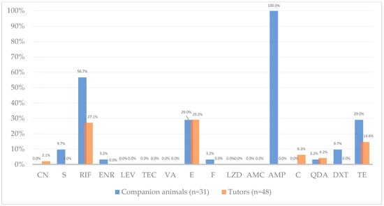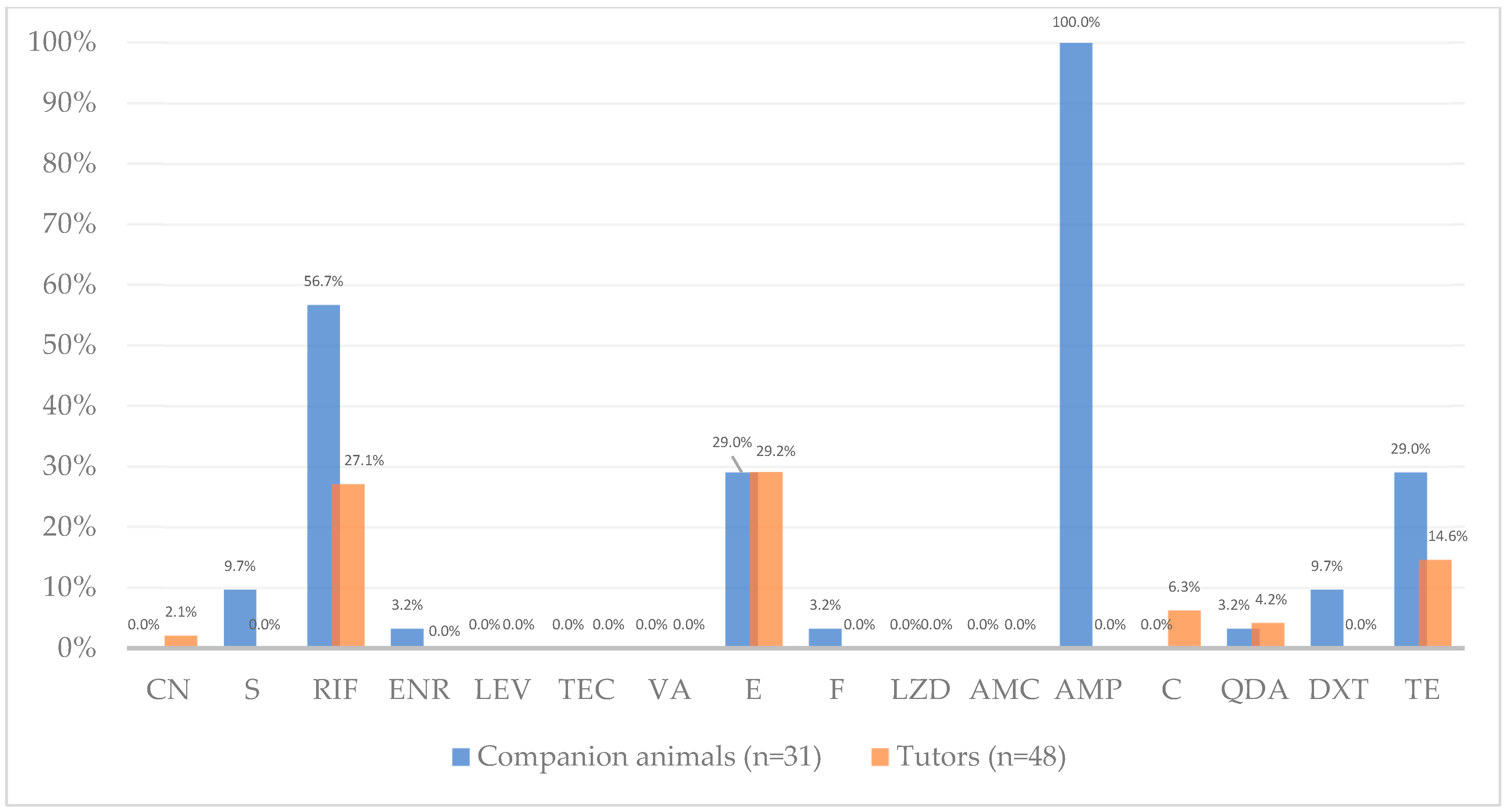 Antimicrobial resistance frequency (%) among Enterococcus from companion animals (blue, n = 31 isolates) and their human tutors (orange, n = 48 isolates). Percentages refer to proportions of isolates resistant to each antibiotic; exact counts are reported in Table 2. Antibiotics tested, by alphabetic order of classes: CN—gentamicin, S—streptomycin, RIF—rifampicin, ENR—enrofloxacin, LEV—levofloxacin, TEC—teicoplanin, VA—vancomycin, E—erythromycin, F—nitrofurantoin, LZD—linezolid, AMC—amoxicillin-clavulanic acid, AMP—ampicillin, C—chloramphenicol, QDA—quinupristin-dalfopristin, DXT—doxycycline, TE—tetracycline. Note: QDA resistance results exclude E. faecalis as this species is intrinsically resistant to this antibiotic.