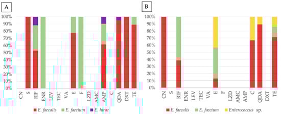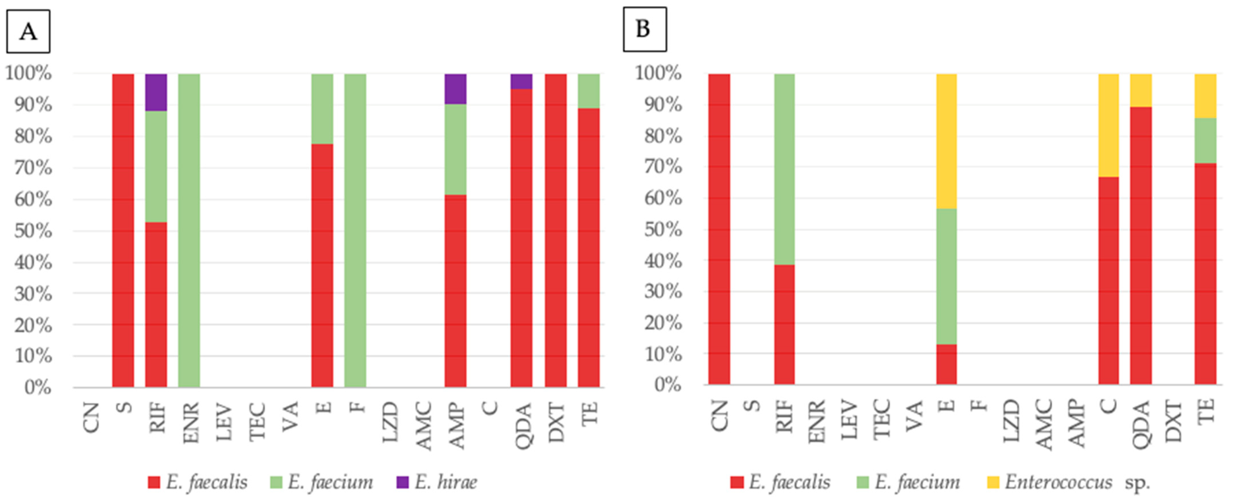 Antimicrobial resistance profiles of Enterococcus from companion animals (A) and tutors (B), with stacked bar plots representing the percentage distribution of resistant isolates for each antibiotic tested, grouped by species: E. faecalis (red), E. faecium (green), E. hirae (purple), and Enterococcus sp. (yellow). Antibiotics tested, by alphabetic order of classes: CN—gentamicin, S—streptomycin, RIF—rifampicin, ENR—enrofloxacin, LEV—levofloxacin, TEC—teicoplanin, VA—vancomycin, E—erythromycin, F—nitrofurantoin, LZD—linezolid, AMC—amoxicillin-clavulanic acid, AMP—ampicillin, C—chloramphenicol, QDA—quinupristin-dalfopristin, DXT—doxycycline, TE—tetracycline.