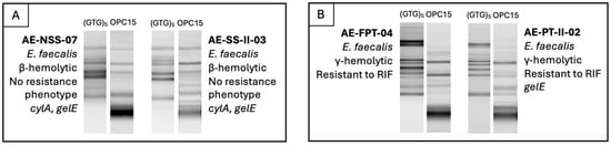 To address Enterococcus similarity from companion animals, humans, and animals and humans co-habiting the same household, RAPD-PCR profiles generated with (GTG)5 and OPC15 primers were analyzed alongside species identification, hemolytic ability, resistance phenotypes and virulence genes. Two similar RAPD profiles, with identical pathogenic-associated characteristics, were identified among humans within the same household (Figure 4), which can indicate shared colonization patterns among the same species and suggest host-specificity.