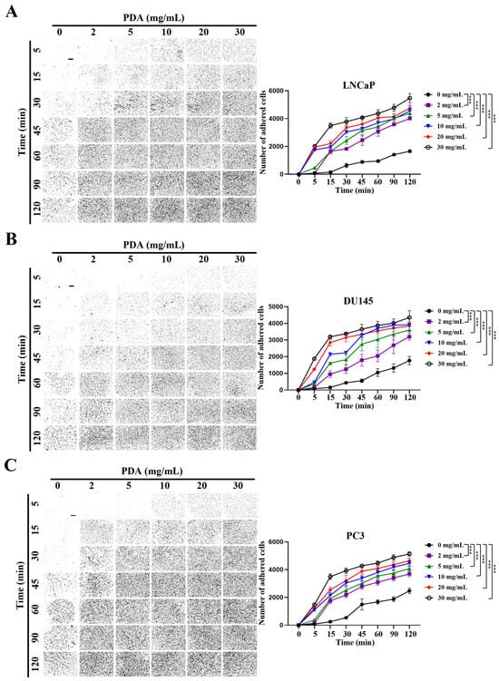 To evaluate the effect of PDA coating on PC cell adhesion, polystyrene plates were coated with increasing concentrations of PDA (0–30 mg/mL), and the attachment of LNCaP, DU145, and PC3 cells was quantified at multiple time points using crystal violet staining (Figure 1). Across all three cell lines, the PDA coating significantly enhanced cell adhesion in a concentration- and time-dependent manner (Figure 1).