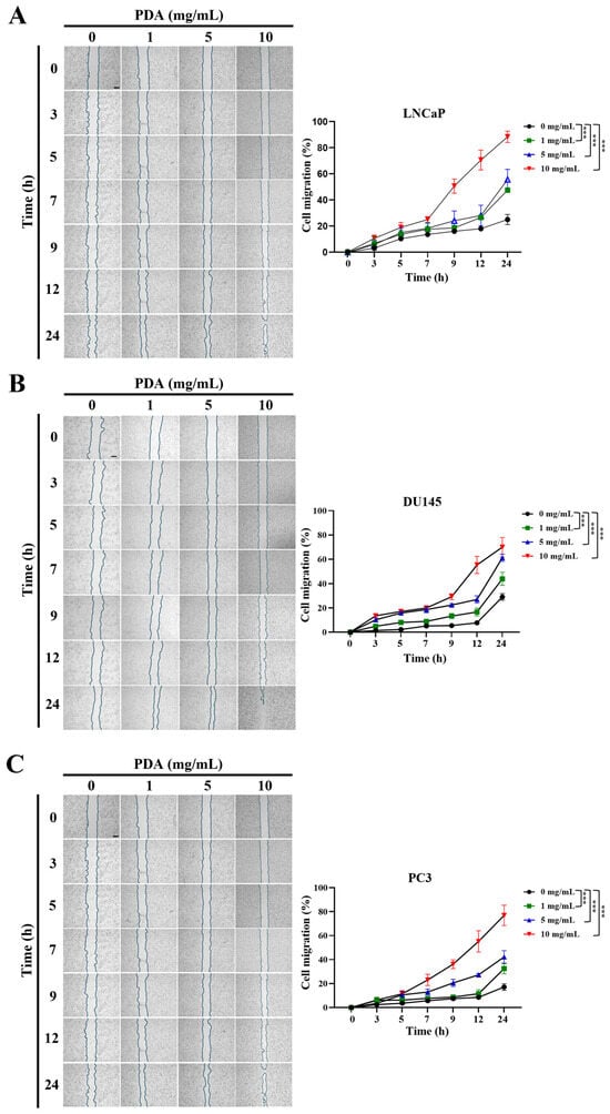 PC3 cells also showed robust enhancement of migration in response to PDA coating (Figure 2C). Two-way ANOVA confirmed significant effects of PDA concentration, incubation time, and their interaction (all p < 0.001). As observed for LNCaP and DU145 cells, 10 mg/mL PDA produced the most pronounced acceleration of wound closure at early and intermediate time points, whereas lower concentrations exhibited less marked effects (Figure 2C). By 24 h, all PDA concentrations significantly increased PC3 cell migration relative to controls (Figure 2C).