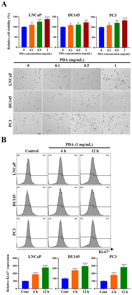 The proliferation of LNCaP, DU145, and PC3 cells was evaluated using a CCK-8 assay after incubation on polystyrene surfaces coated with increasing PDA concentrations (0–1 mg/mL) (Figure 4A). The PDA coating significantly increased cell proliferation at 24 h in all three cell lines, with the greatest effect observed at 1 mg/mL (Figure 4A). Lower PDA concentrations (0.1–0.5 mg/mL) also produced moderate increases. Consistent with these findings, phase-contrast images showed higher cell densities on the PDA-coated surfaces (Figure 4A).