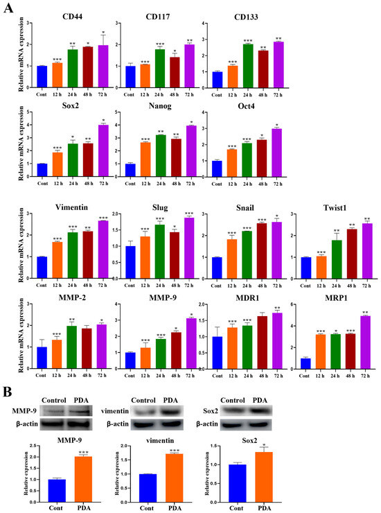 Western blotting further demonstrated the PDA-induced elevation of MMP-9, vimentin, and Sox2 protein levels, with 1.3-, 1.7-, and 1.3-fold increases in LNCaP cells at 72 h, respectively (p < 0.05–0.001) (Figure 6B), and a two-fold increase in MMP-9 in PC3 cells at 72 h.