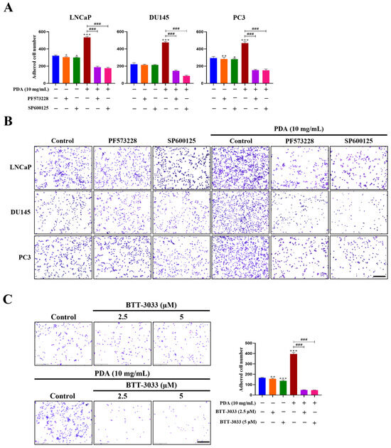 To determine whether FAK mediates PDA-induced adhesion, migration, and invasion of human PC cells, pharmacological inhibition studies were performed. PC3, LNCaP, and DU145 cells showed markedly increased adhesion to 10 mg/mL PDA-coated surfaces compared to uncoated controls, showing 22.8-, 22.9-, and 26.7-fold increases, respectively, compared with uncoated controls (p < 0.01–0.001; Figure 7). Pretreatment with the FAK inhibitor PF573228 (10 μM), JNK inhibitor SP600125 (30 μM), or integrin α2β1 inhibitor BTT-3033 (2.5 and 5 μM) effectively abolished the PDA-induced adhesion in all cell lines (Figure 7). Notably, treatment with PF573228, SP600125, and BTT-3033 exerted minimal effects on basal adhesion in cells cultured on uncoated control surfaces (Figure 7C). These results indicate that integrin–FAK–JNK signaling is selectively amplified in the context of enhanced cell adhesion under PDA-coated conditions, rather than reflecting nonspecific inhibitory effects of the compounds.