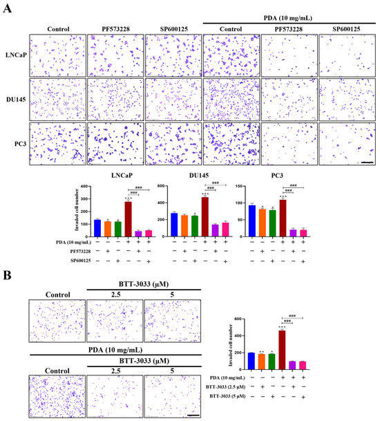 Hydrogel invasion assays further demonstrated that 10 mg/mL PDA-coated cells displayed a significantly greater invasive capacity than uncoated controls at 20 h (Figure 9). The number of invaded cells under PDA coating conditions relative to control was approximately 3.0-fold higher for LNCaP cells (Control 135.3 ± 7.02; PDA: 278.3 ± 15.04, p < 0.001), and 5.0-fold higher for DU145 cells (Control 277.0 ± 15.4; PDA: 466.3 ± 17.24, p < 0.001), and 1.2-fold higher for PC3 cells (Control 93.3 ± 5.86; PDA: 109.7 ± 5.03, p < 0.05), (Figure 9). This overall increase was most pronounced in LNCaP and DU145 cells and was eliminated by FAK, JNK, or integrin α2β1 inhibition across all cell lines (Figure 9). Notably, treatment with PF573228, SP600125, and BTT-3033 exerted minimal effects on basal invasion in cells cultured on uncoated control surfaces (Figure 9B). These results indicate that integrin–FAK–JNK signaling is selectively amplified in the context of enhanced cell invasion under PDA-coated conditions, rather than reflecting nonspecific inhibitory effects of the compounds.