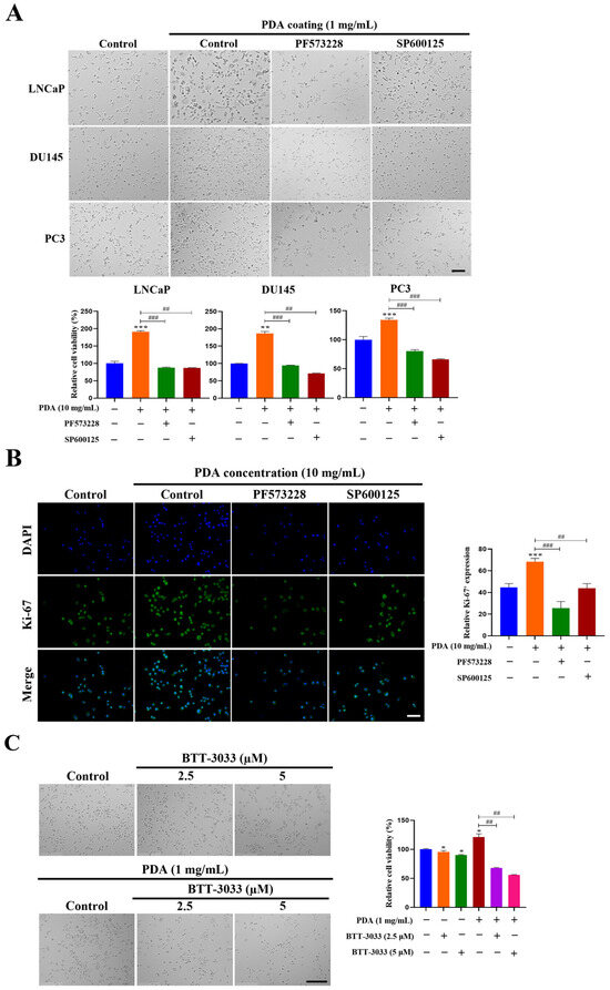 To determine whether the PDA-induced proliferation was mediated by integrin-dependent signaling, cells were cultured on 10 mg/mL PDA-coated surfaces in the presence of pathway inhibitors. Treatment with the FAK inhibitor PF573228 (10 µM) or JNK inhibitor SP600125 (30 µM) suppressed the PDA-enhanced proliferation in the LNCaP, DU145, and PC3 cells (Figure 10B). Confocal imaging further demonstrated an increase in Ki-67 expression following PDA exposure, which was reduced by the FAK or JNK inhibitor (Figure 10B). Notably, treatment with BTT-3033 exerted minimal effects on basal proliferation in cells cultured on uncoated control surfaces, whereas the inhibitory effects of BTT-3033 (2.5 and 5 µM) were markedly more pronounced under PDA-coated conditions (Figure 10C–E). These results indicate that integrin–FAK–JNK signaling is selectively amplified in the context of enhanced cell proliferation under PDA-coated conditions, rather than reflecting nonspecific inhibitory effects of the compounds.