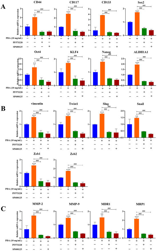 To determine whether FAK–JNK signaling mediates the PDA-induced upregulation of malignancy-associated genes, a qRT-PCR analysis was performed in PC3 cells following adhesion to PDA-coated surfaces (10 mg/mL) for 24 h (Figure 11). The PDA coating significantly increased the expression of EMT-associated transcription factors (Snail, Slug, Twist1, Zeb1, Zeb2, and vimentin), matrix metalloproteinases (MMP-2 and MMP-9), stemness-related markers (CD44, CD133, SOX2, KLF4, ALDH1A1, and NANOG), and multidrug resistance-associated genes (MDR1 and MRP1) compared to the uncoated controls (Figure 11).