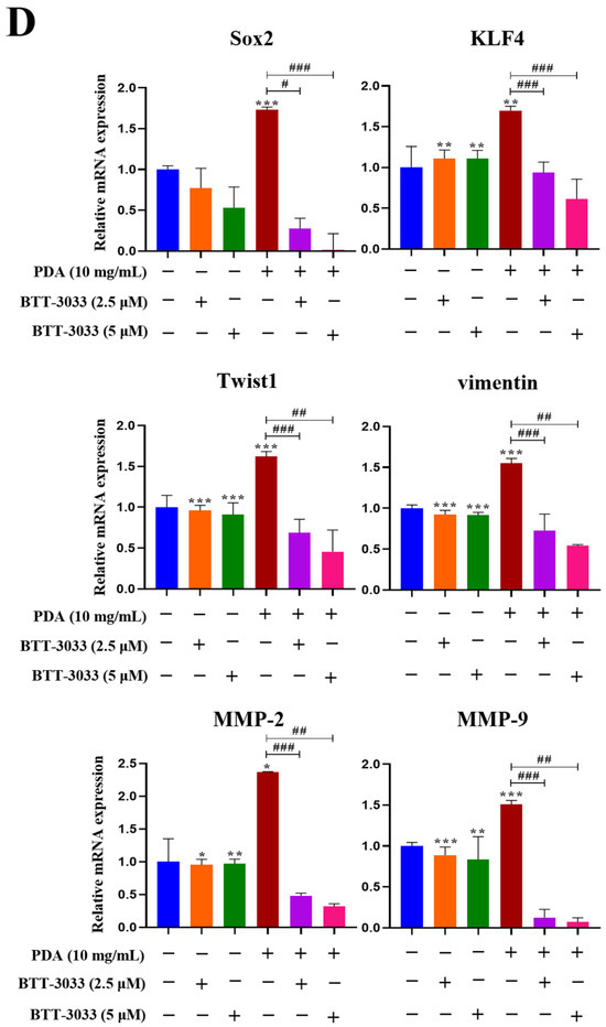 Notably, treatment with BTT-3033 exerted minimal effects on basal mRNA expression levels of stemness-related genes (Sox2 and KLF4), EMT-associated transcription factors (Twist1 and vimentin), and matrix metalloproteinases (MMP-2 and MMP-9) in PC3 cells cultured on PDA-coated polystyrene surfaces (10 mg/mL) for 24 h, whereas the inhibitory effects of BTT-3033 (2.5 and 5 µM) on the mRNA expression levels of these key genes associated with malignant phenotypes markedly more pronounced under PDA-coated conditions (Figure 11D). These results indicate that integrin–FAK–JNK signaling is preferentially engaged by PDA-induced malignant gene-expression programs, rather than reflecting nonspecific inhibitory effects of the compounds.