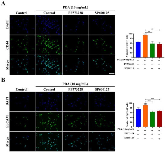 Consistent with the qRT-PCR findings shown in Figure 11, confocal imaging showed increased expressions of the CSC-associated surface markers CD44 and EpCAM in PC3 cells after 24 h on PDA-coated surfaces (10 mg/mL) compared to uncoated controls (1.4- and 1.2-fold increases, respectively; p < 0.001–0.05) (Figure 12). These effects were suppressed by pretreatment with the FAK inhibitor PF573228 (10 µM) or JNK inhibitor SP600125 (30 µM) (Figure 12).