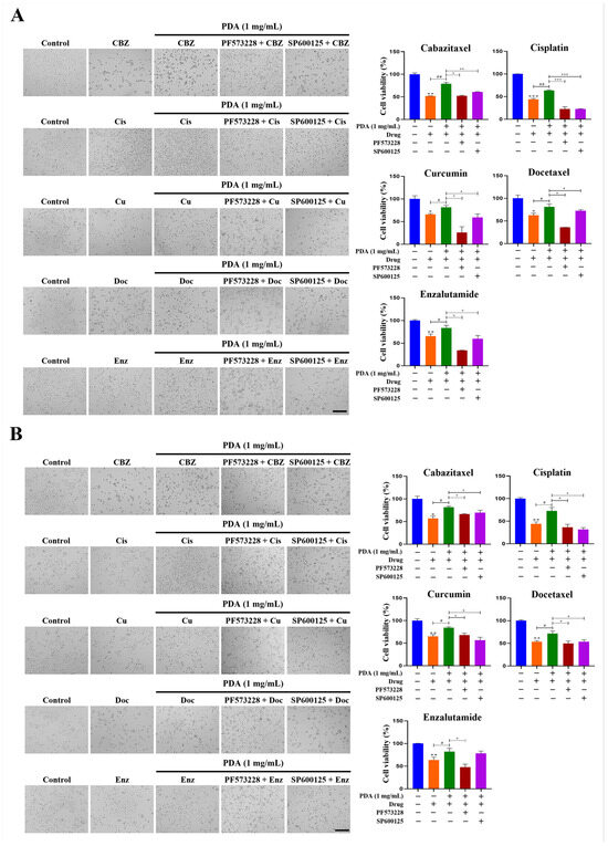 In PC3 cells, the PDA coating increased the cell viability following treatment with cabazitaxel (10 nM), cisplatin (100 µM), curcumin (50 µM), docetaxel (200 nM), and enzalutamide (25 µM) by 1.4- (p < 0.01), 1.5- (p < 0.01), 1.3- (p < 0.05), 1.3- (p < 0.05), and 1.3-fold (p < 0.05), respectively (Figure 13C).