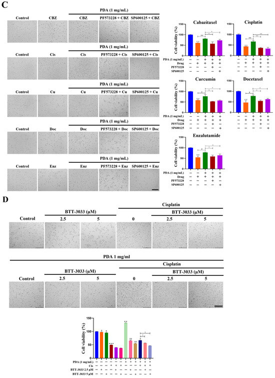 Effects of PDA coating and integrin–FAK–JNK pathway inhibition on chemosensitivity of human PC cells, but this effect is reversed by FAK, JNK, or integrin α2β1 inhibition. (A–C) WST-1 cytotoxicity assays showing viability of LNCaP (A), DU145 (B), and PC3 (C) cells cultured on PDA-coated polystyrene surfaces (1 mg/mL) following treatment with cabazitaxel (10 nM), cisplatin (100 µM), curcumin (50 µM), docetaxel (200 nM), or enzalutamide (25 µM) for 24 h, in the presence or absence of the FAK inhibitor PF573228 (10 µM) or the JNK inhibitor SP600125 (30 µM) (original magnification ×100). (D) WST-1 cytotoxicity assays showing viability of PC3 cells cultured on PDA-coated polystyrene surfaces (10 mg/mL) following treatment with cisplatin (100 µM) for 24 h, with or without the integrin α2β1 inhibitor BTT-3033 (2.5 and 5 µM). Representative phase-contrast images corresponding to each condition are shown (original magnification ×100). Data are presented as mean ± SD from three independent experiments performed in triplicate. Statistical significance was determined relative to uncoated control cells (* p < 0.05, ** p < 0.01, and *** p < 0.001 vs. uncoated control; # p < 0.05, and ## p < 0.01 vs. PDA-coated control; and + p < 0.05, ++ p < 0.01, and +++ p < 0.001 vs. PDA-coated + drug-treated group; scale bar = 275 µm).