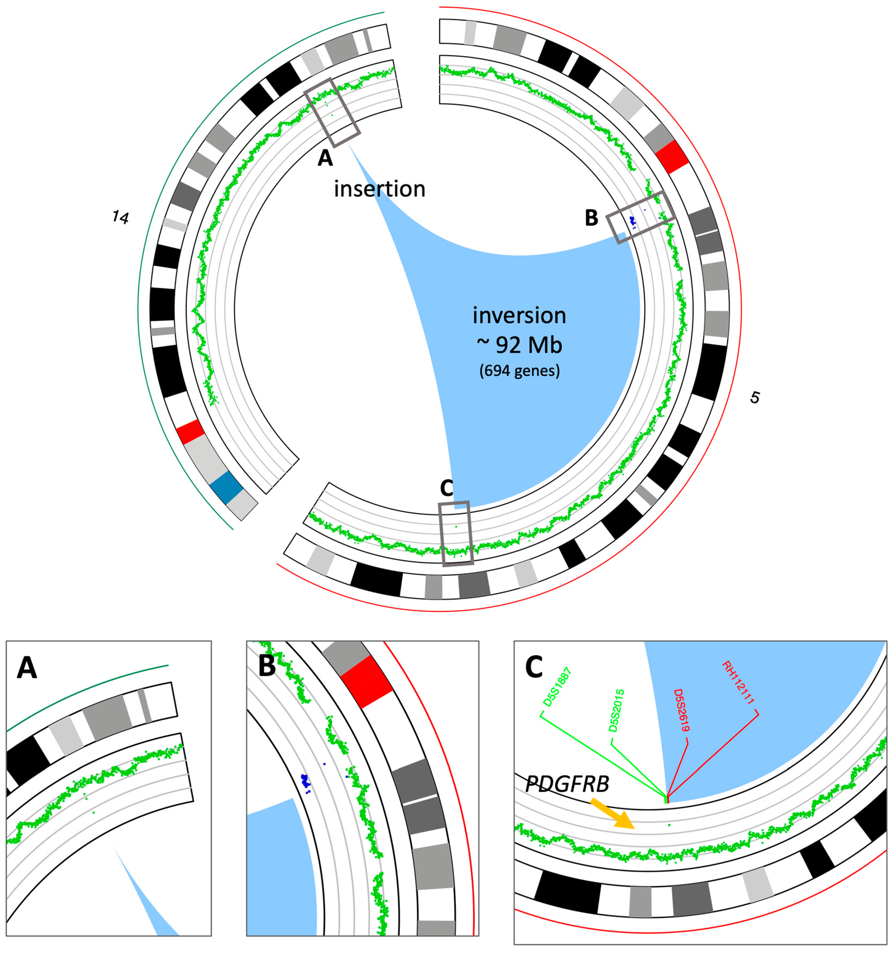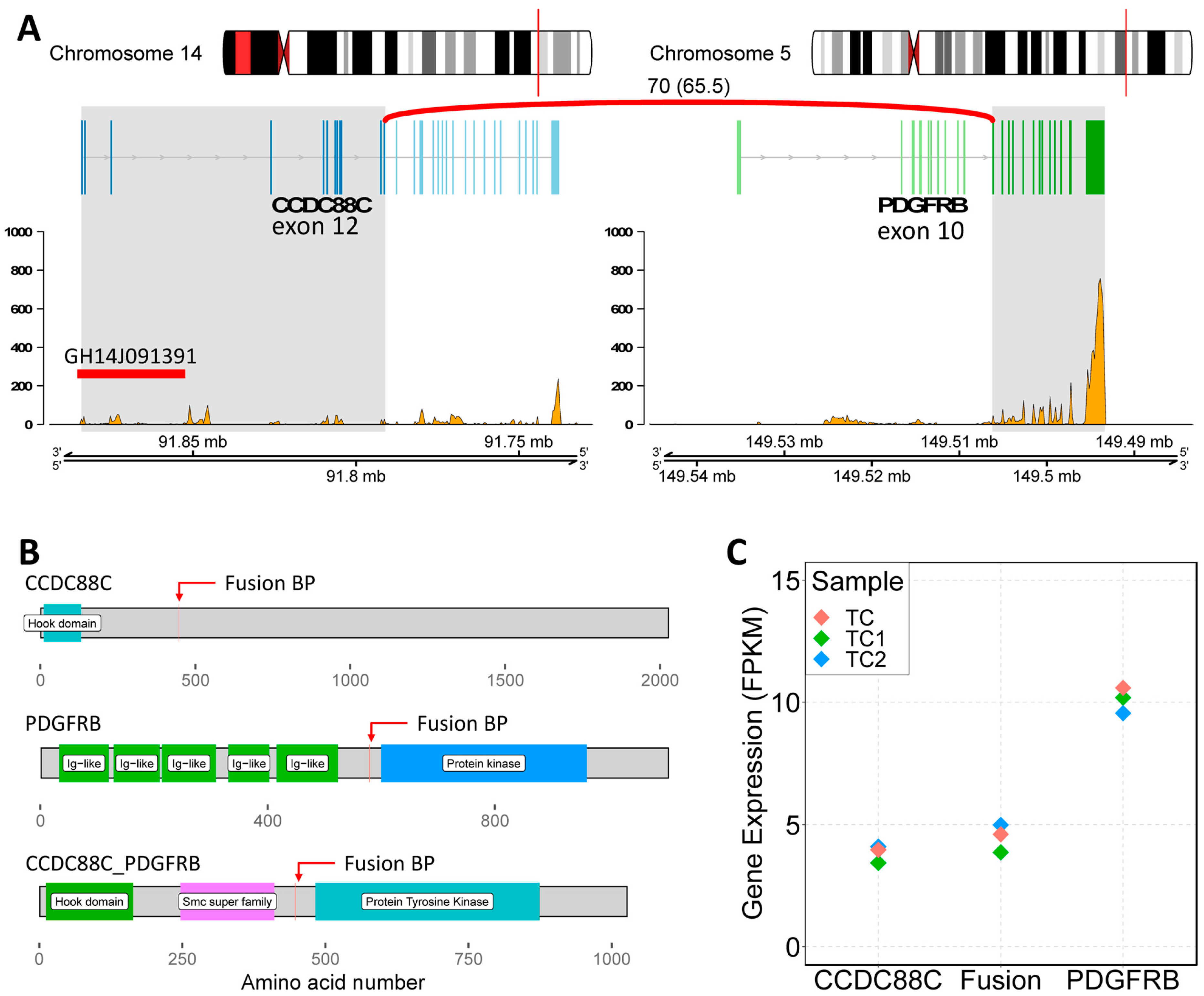 - Gosenca, D.; Kellert, B.; Metzgeroth, G.; Haferlach, C.; Fabarius, A.; Schwaab, J.; Kneba, M.; Scheid, C.; Töpelt, K.; Erben, P.; et al. Identification and functional characterization of imatinib-sensitive DTD1-PDGFRB and CCDC88C-PDGFRB fusion genes in eosinophilia-associated myeloid/lymphoid neoplasms. Genes Chromosomes Cancer 2014, 53, 411–421. [Google Scholar] [CrossRef]