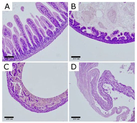 Representative histopathological changes in the intestinal wall of rats with experimental NEC. H&E-stained bowel sections illustrate the grading scale: (A) normal ileum (grade 0); (B) grade 1, partial villous atrophy; (C) grade 2, epithelial sloughing and/or necrosis limited to the upper portions of atrophic villi; (D) grade 3, complete villous loss with transmural intestinal necrosis. Images shown at 200× magnification. Scar bar: 100 μm. Photomicrographs were acquired using OPTIKA LITEView (OPTIKA; Windows x64 v2.1.24744.20240303; Ponteranica, Italy). Source: authors’ own material.