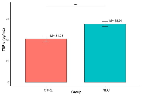 Similarly, TNF-α concentrations were significantly increased in the NEC group relative to CTRL (M = 68.94, SD = 24.41 vs. M = 51.23, SD = 12.29; p < 0.001). (Table 3, Figure 3).