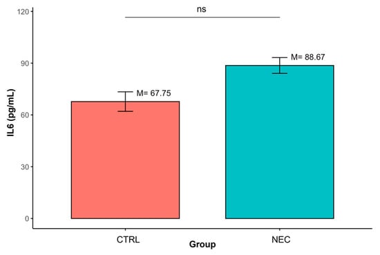 Differences in IL-6 concentrations between groups defined by the ‘Group’ variable (ns—non-significant result); data are presented as mean ± SD (error bars) CTRL n = 12, NEC n = 62.