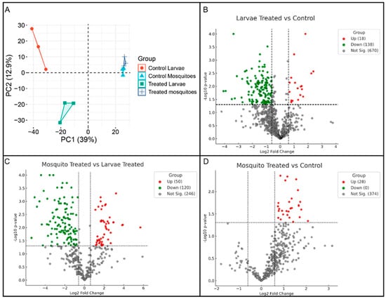 Multivariate and differential abundance analyses of A. aegypti proteomes under heme exposure. (A) Principal component analysis (PCA) of whole-body proteomic profiles from control and hemin-treated fourth-instar larvae and adult females. PC1 (39% of variance) separates samples according to developmental stage, whereas PC2 (12.9%) captures treatment- and condition-dependent variation within each stage. (B) Volcano plot showing differentially abundant proteins in larvae (hemin-treated vs. control). Proteins with significant differential abundance (log2 fold change ≥ |0.60|, p < 0.05) are highlighted, with upregulated proteins shown in red, downregulated proteins in green, and non-significant proteins in gray. (C) Volcano plot showing differentially abundant proteins in hemin-treated adult females vs. hemin-treated larvae, highlighting stage-specific proteomic adjustments under heme exposure. (D) Volcano plot showing differentially abundant proteins in hemin-treated vs. control adult females, illustrating the proteomic response of adult mosquitoes to heme exposure.