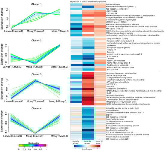 To explore stage-specific proteomic trajectories, soft clustering was performed using Mfuzz, grouping proteins based on their log2 fold-change profiles across the LarvaeT/LarvaeC, Mosq.T/LarvaeT, and Mosq.T/Mosq.C comparisons. Four distinct clusters were identified, and heatmaps displaying the top 15 proteins with the highest membership scores in each cluster were generated (Figure 2).