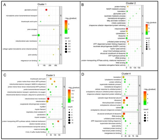 Gene Ontology (GO) enrichment analysis of Mfuzz protein clusters. Proteins from each cluster were analyzed for enrichment of Gene Ontology terms in the Biological Process (BP), Cellular Component (CC), and Molecular Function (MF) categories. (A) Cluster 1, enriched for pathways related to glycolysis and mitochondrial metabolism. (B) Cluster 2, enriched for chromatin organization and structural components. (C) Cluster 3, enriched for oxidative phosphorylation and ATP synthesis. (D) Cluster 4, enriched for ribosome biogenesis, translation, and stress-related processes, including antioxidant and protein-folding functions.